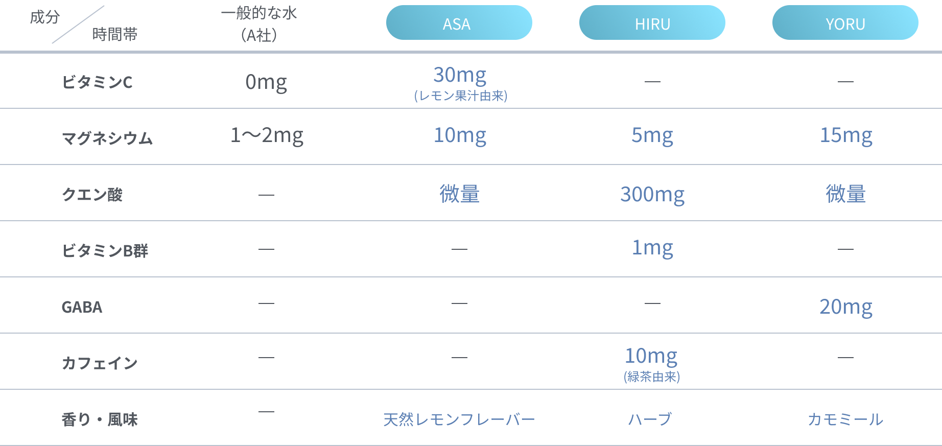A. 時間指定は設定しておりませんが、可能であれば、ASAは起きてすぐにHIRUは昼食中・昼食後にYORUは就寝前にお飲みいただけるとより良い習慣になるかと思います。